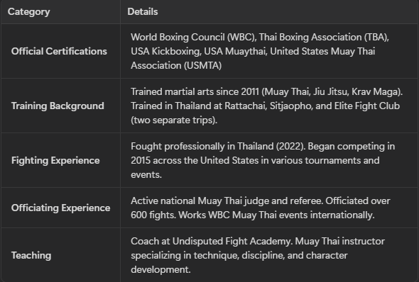 Beyond his own training and competition, Wagner has dedicated himself to ensuring the integrity, growth, and proper development of Muay Thai in the United States. He is a nationally certified official with an impressive and comprehensive list of credentials from the most prestigious organizations in combat sports. His certifications include the World Boxing Council (WBC), the Thai Boxing Association (TBA), USA Kickboxing, USA Muaythai, and the United States Muay Thai Association (USMTA). This breadth of certification speaks to his commitment to understanding the sport from multiple perspectives and ensuring that he can officiate under various rule sets and organizational standards.